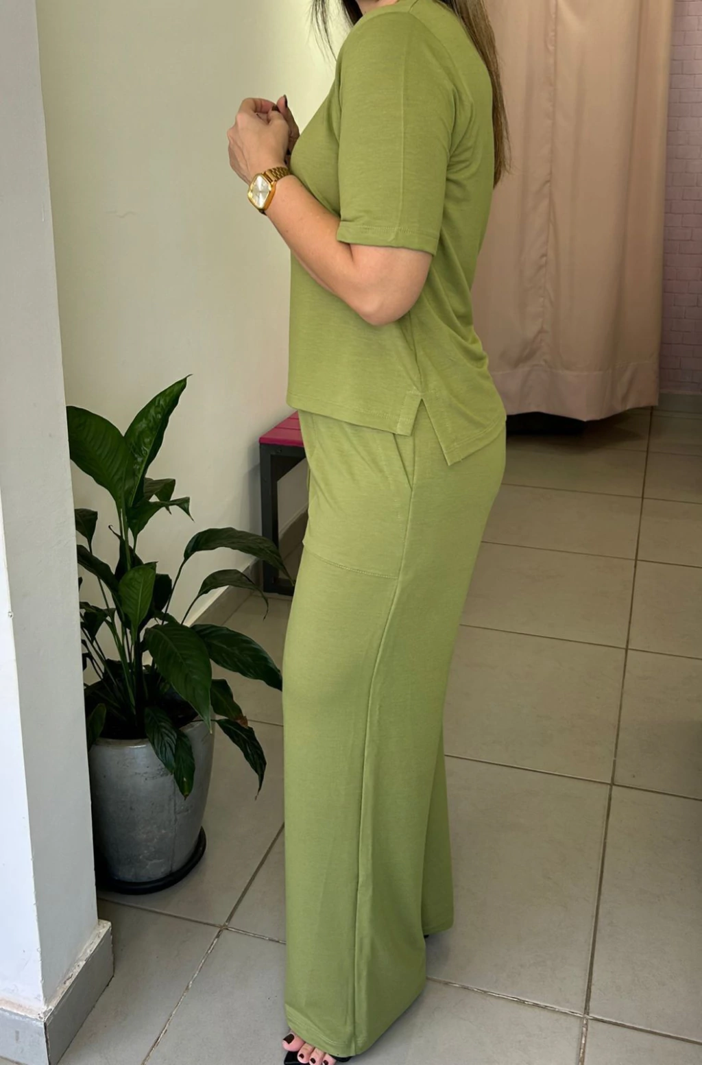 Este conjunto é ideal para ocasiões em que você deseja expressar seu estilo com elegância sem abrir mão do conforto. A malha de moletinho premium oferece toque suave e resistência, enquanto o design sofisticado da blusa com mini fenda e da calça pantalona cria um look contemporâneo e versátil.